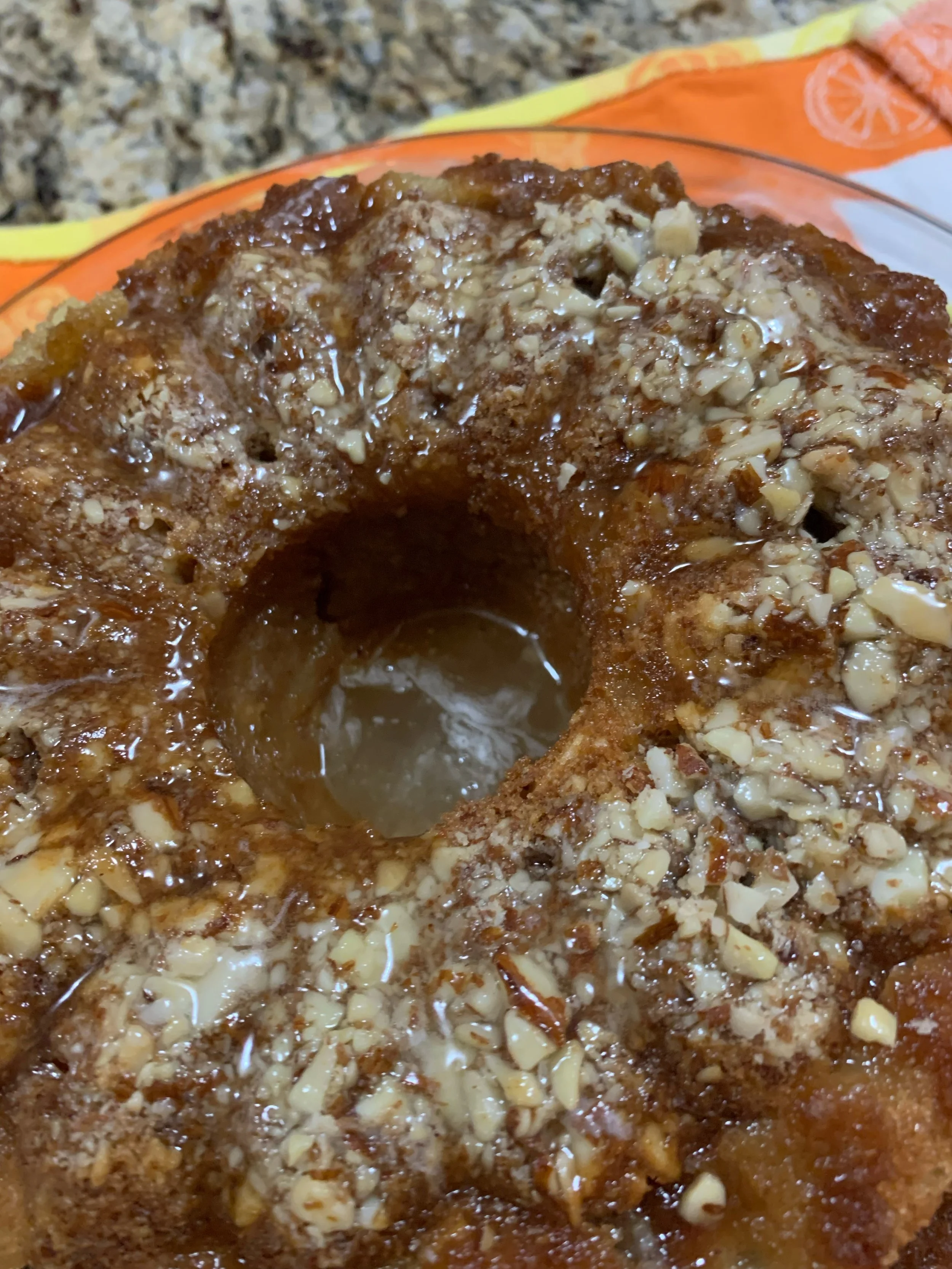 This rum cake is made from scratch with a cake base topped with walnuts and suffused with rum syrup.